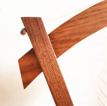 Pour l'anecdote, le bois du socle n'est pas teinté et fait partie de la même planche. Les différences de couleur viennent du fait que pour qu'un collage soit stable, le bois doit être collé à fil et à contre-fil (rotation de 90° pour chaque pièce de bois collée) pour chaque morceau superposé. Les parties les plus sombres sont celles où les canaux du bois sont coupés perpendiculairement, là où le bois absorbe plus l'huile. C'est pour cette raison que le bois est plus foncé à ces endroits.